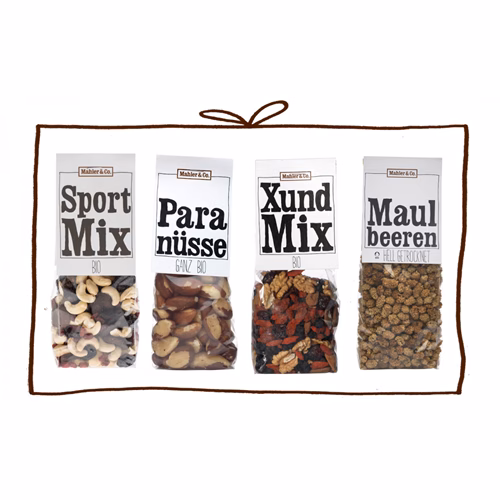 Mit dem Geschenkset Dranne blibe von Mahler & Co. kommt Energie direkt aus der Natur. Vier kraftvolle Bio-Snacks unterstützen Training, Regeneration und alle Momente, in denen der Körper neue Nährstoffe braucht. Der Sport-Mix liefert beim Biken oder Hiken Schubkraft und unterstützt auch die Erholungsphase mit einer ausgewogenen Mischung aus Früchten und Nüssen. Der Xund-Mix kombiniert herb-süsse und nussige Zutaten zu einem Snack, der gut tut, leicht zu mögen ist und durch seinen abwechslungsreichen Geschmack jeden Tag passt.