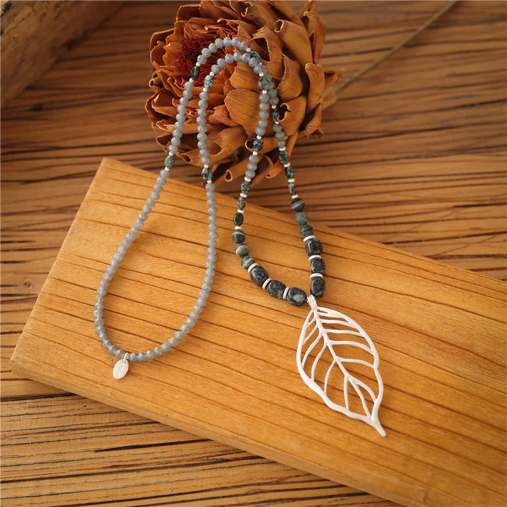 Halskette mit echter afrikanischer grüner Jade und silbernem Blattanhänger – Andreani Schmuck