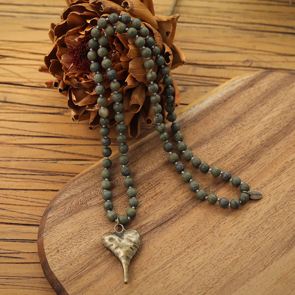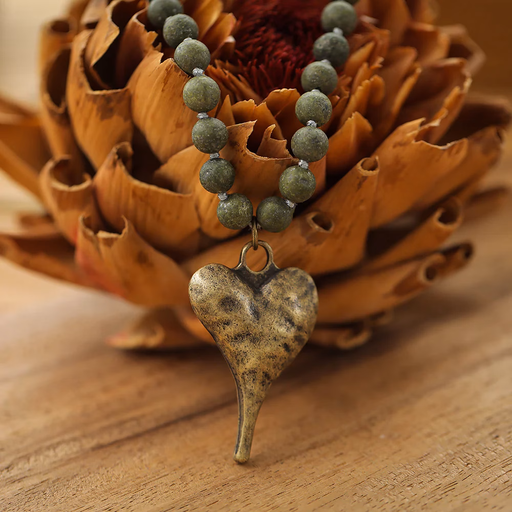 Diese edle, handgefertigte Halskette besteht aus echter afrikanischer grüner Jade, einem Stein, der für Beruhigung, Harmonie und innere Ausgeglichenheit steht. Der Herzanhänger in Kupferoptik verleiht der Kette eine warme, stilvolle Note – ein wunderschönes Accessoire für alle, die Natürlichkeit und Eleganz schätzen.