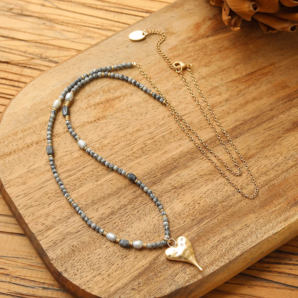 Halskette mit echtem Picasso Jaspis und mattem goldenen Herzanhänger – Andreani Schmuck