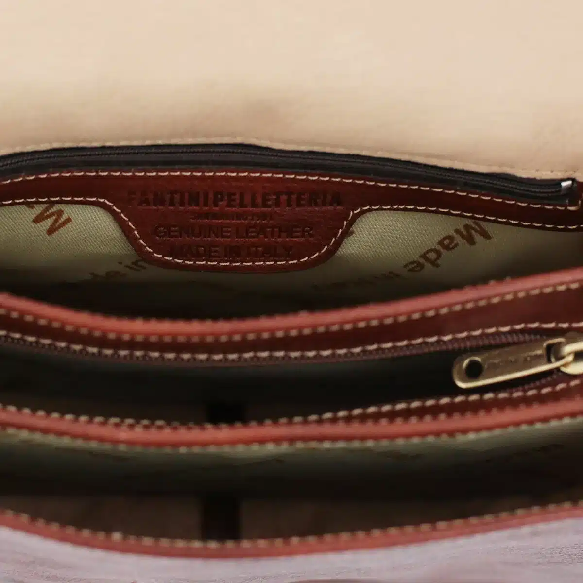 Im Inneren sorgen mehrere praktische Fächer für Ordnung und Komfort – ideal für Spaziergänge, Büro, Universität, Reisen oder ein Treffen mit Freunden. Der geprägte Markenstempel von Fantini Pelletteria macht jede Tasche einzigartig und unterstreicht ihren exklusiven Stil.