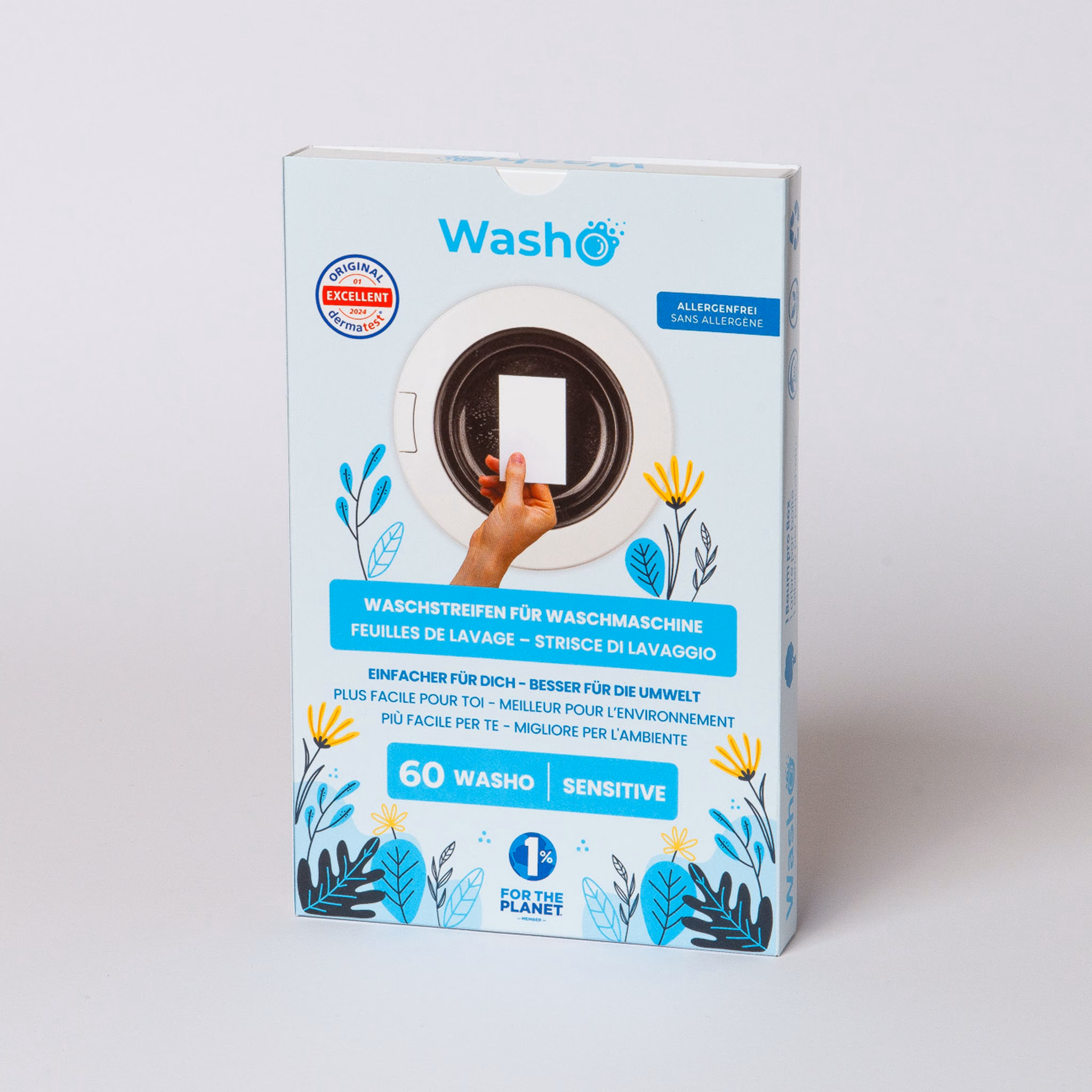 Wie alle Washo Produkte sind auch die Sensitive-Streifen plastikfrei, biologisch abbaubar und kommen in einer kompakten, recycelbaren Kartonverpackung. Sie lösen sich vollständig auf, hinterlassen keine Rückstände in der Maschine und machen das Waschen einfach, sicher und nachhaltig – für dich und die Umwelt.