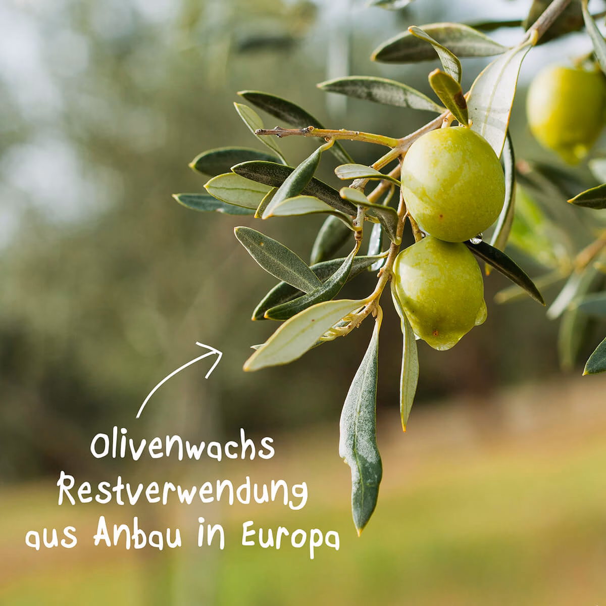 Das verwendete Olivenwachs stammt aus dem Mittelmeerraum und wird aus der zweiten Pressung der Oliven gewonnen – so wird die gesamte Pflanze verwertet. Die kurzen Transportwege der Rohstoffe sowie die vollständige Nutzung machen diese Kerze zu einer nachhaltigen Alternative zu herkömmlichen Wachstypen.